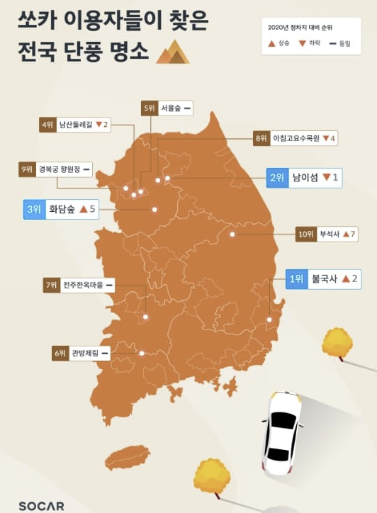 단풍명소 1위부터 10위까지 소개해드리려고 합니다. (데이터 출처: 쏘카 정차 데이터)